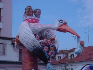 Como manda a tradicão, é na Praça da República, em pleno centro da cidade, que encontramos o "Grande Galo, Zé!", o Monumento do Carnaval de Torres Vedras 2019. Não há postal do nosso país que não tenha o Cristo Rei, o Aqueduto das Águas Livres, um elétrico amarelo, o Galo de Barcelos ou uma praça de touros. Um dos principais símbolos cá do burgo é o Galo de Barcelos! Figura replicada e comercializada em todo o território nacional, chega ao Carnaval completamente enfurecida pelos maus tratos constantes à nação! No seu dorso segue montado, em pose acrobática, António Costa. A escorregar pelo pescoço, ou em queda mais ou menos controlada, vêm Catarina Martins e Jerónimo de Sousa, a dar as últimas pela geringonça. Na asa, mas cada vez mais longe do poder, vai tentando subir Assunção Cristas, em esforço e quase derrotada. Na barbela do galo a tentar um “assalto” ao poder vão-se equilibrando Rui Rio e o renascido Santana Lopes, que já leva na sua perna para a Aliança o torriense Paulo Bento. O Zé, completamente despido de todos os pertences, continua a ser “toureado” pelos saqueadores do país, num Monumento que ainda conta com a “presença” de Cristina Ferreira e Manuel Luís Goucha, “Cris7o” Ronaldo, Luís Filipe Vieira, Pinto da Costa, Varandas e Carlos Bernardes. Até Amália e Eusébio se juntaram ao “Grande Galo, Zé!”